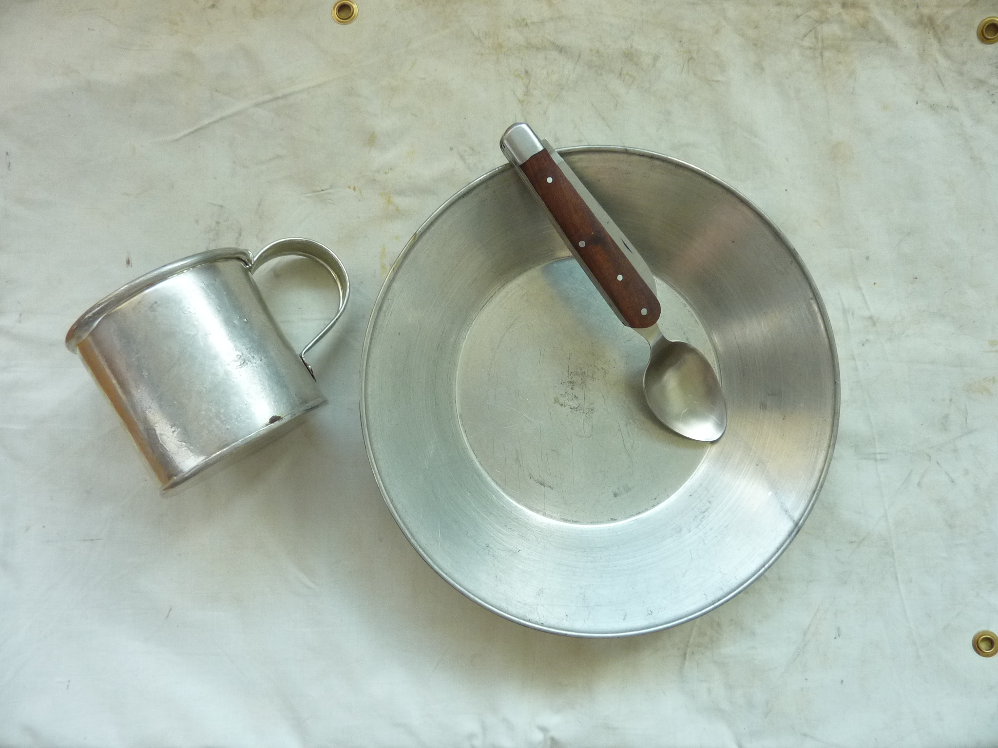 Základní nádobí: talíř a hrnek z pocínovaného plechu a příbor (zde jedna z dobových patentních variant)